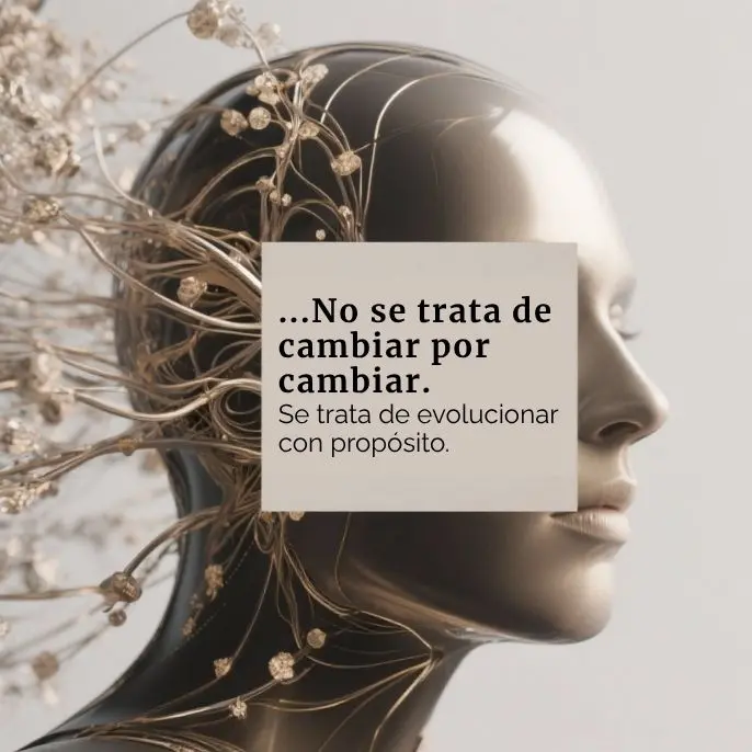 A conceptual image representing the expression It's not about change for the sake of change. It's about evolving with purpose, displaying in Spanish: No se trata de cambiar por cambiar. Se trata de evolucionar con propósito.